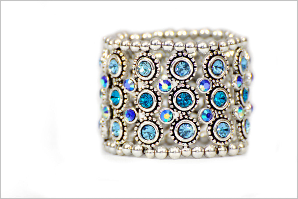 Rows of metal get dressed up with glittering blue rhinestones. The ideal accessory to any night out.